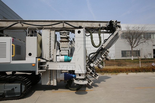 The stroke of the power head is 14m, and the length of the drill rod is 15m. It can drill a hole and jet-grouted pile in one go. Feeding and pulling back by hoist; the gripper supporting drill rods and shackles, the labor intensity is reduced. The front end of the rear gripper is equipped with a pull-back cylinder. The stroke of it is 600mm and the pulling back force is 15.7 tons. When the drill is stuck, the winch can pull back forcibly.