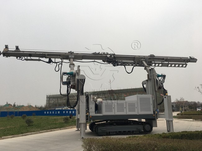 6. Structural parts: Frame slewing mechanism, dual-arm supporting, and mast are integrated into the compact structure. Dual-arm supporting is two-grade lifting, stable supporting, avoiding drift during deep hole operation. The first grade with a turning machanism can rotary ±120°. It can achieve multi-hole operation in the same working plane for improving work efficiency. The mast is composed of three sections, both ends are foldable for easy transportation. The power head has a four-grade speed change, a wide speed range, and large torque. (Optional hydraulic impact power head)