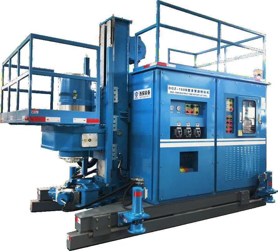 DGZ-150B drilling rig is suitable DG multi-tube rotary grouting construction with a drill diameter of 142mm or less. Load-sensitive hydraulic control systems and self-developed electronic control systems are adopted. The main hydraulic parts are from an international famous suppliers, which are stable and durable. The whole machine adopts the combination of hydraulic control and electric control, which is simple and flexible to operate, saving time. The compact structure design is easy for moving. It is equipped with a monitoring system. It is on the driller control coard that shows mud volume, air volume, ground pressure, rotating speed, lifting speed, lifting and stepping distance, and wing angle. The instantaneous mud volume, cumulative mud volume, instantaneous grouting pressure, lifting speed, pressure in the bottom of the hole, air pressure, airflow, cutting water pressure and cutting water flow, etc.