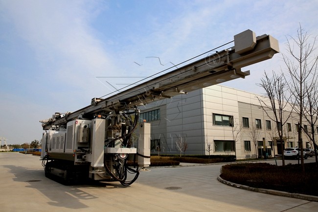 6. Structural parts: Frame slewing mechanism, dual-arm supporting, and mast are integrated into the compact structure. Dual-arm supporting is two-grade lifting, stable supporting, avoiding drift during deep hole operation. The first grade with a turning machanism can rotary ±120°. It can achieve multi-hole operation in the same working plane for improving work efficiency. The mast is composed of three sections, both ends are foldable for easy transportation. The power head has a four-grade speed change, a wide speed range, and large torque. (Optional hydraulic impact power head)